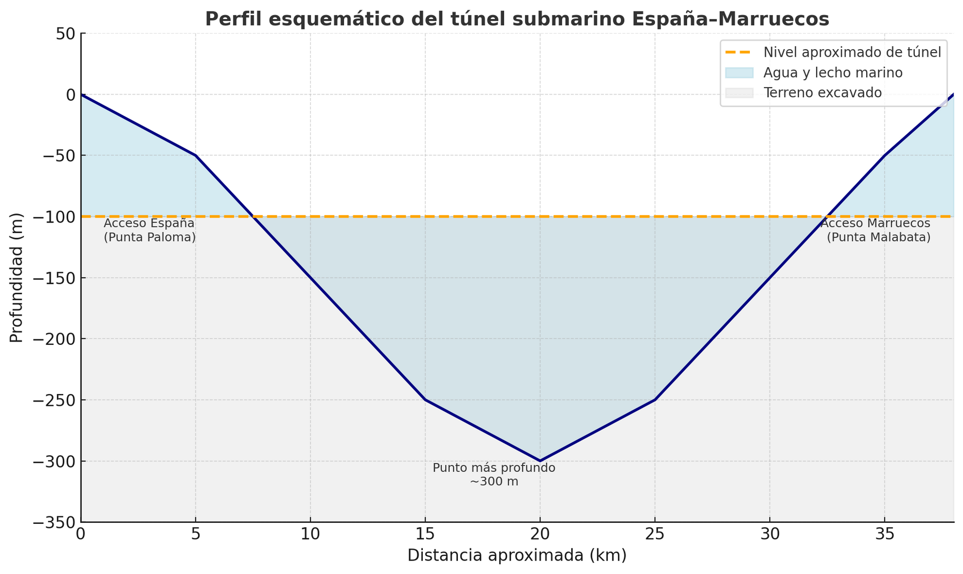 La siguiente imagen muestra un perfil esquemático del túnel previsto, con sus accesos, longitud y punto más profundo: