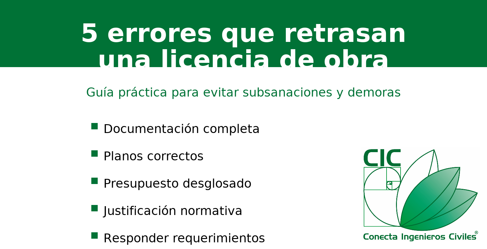 1. No adjuntar toda la documentación requerida Qué ocurre: Falta memoria, planos, presupuesto, declaración responsable u otros anexos exigidos por ordenanza. El ayuntamiento requiere subsanar y el reloj corre. Cómo evitarlo: Revisa la ordenanza municipal y la normativa autonómica aplicable. Usa una checklist previa a la presentación. Consulta dudas con el técnico municipal antes de registrar. 2. Planos incompletos o con errores Qué ocurre: Planos sin escala, acotaciones ilegibles o incoherencias entre plantas, alzados y secciones. Imposible verificar la adecuación de la obra. Cómo evitarlo: Asegúrate de que estén firmados y fechados por técnico competente. Incluye plantas, alzados, secciones y detalles según normativa. Comprueba legibilidad y coherencia antes de firmar. 3. Presupuesto mal detallado Qué ocurre: Un presupuesto genérico impide calcular tasas (p. ej., ICIO ) y dificulta comprobar el alcance. Cómo evitarlo: Desglosa por capítulos y partidas . Usa bases de precios oficiales (p. ej., Junta de Extremadura). Incluye IVA y costes indirectos previstos. 4. Falta de justificación normativa Qué ocurre: No se explica el cumplimiento de planeamiento, accesibilidad, seguridad y eficiencia energética; llegan las aclaraciones. Cómo evitarlo: Añade un apartado de cumplimiento normativo en la memoria. Adjunta certificados y cálculos cuando proceda. 5. Retrasar la respuesta a requerimientos Qué ocurre: El expediente queda paralizado si tardas en contestar a subsanaciones o aclaraciones. Cómo evitarlo: Vigila notificaciones electrónicas y correo. Responde lo antes posible (o solicita prórroga). Contacta con el técnico municipal para aclarar dudas.